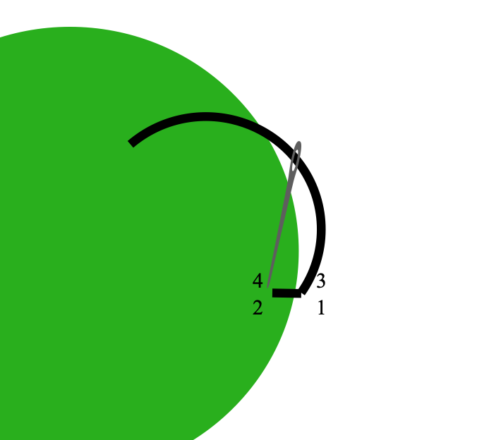 Now we can overcast. Using embroidery thread, bring your needle up just outside of the piece you are overcasting. Make a stitch by bringing your needle down just inside the shape, covering the stitches you used to tack it down. Make another stitch right next to the first so there is no gap between them. Continue in this fashion until you have gone all the way around the eye. Tie off your thread at the back of the fabric.