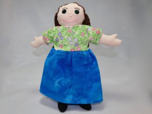 This doll features long red pigtails, green eyes, and a bright floral dress. She is about 11 inches tall and made of 100% cotton fabric with acrylic yarn hair.